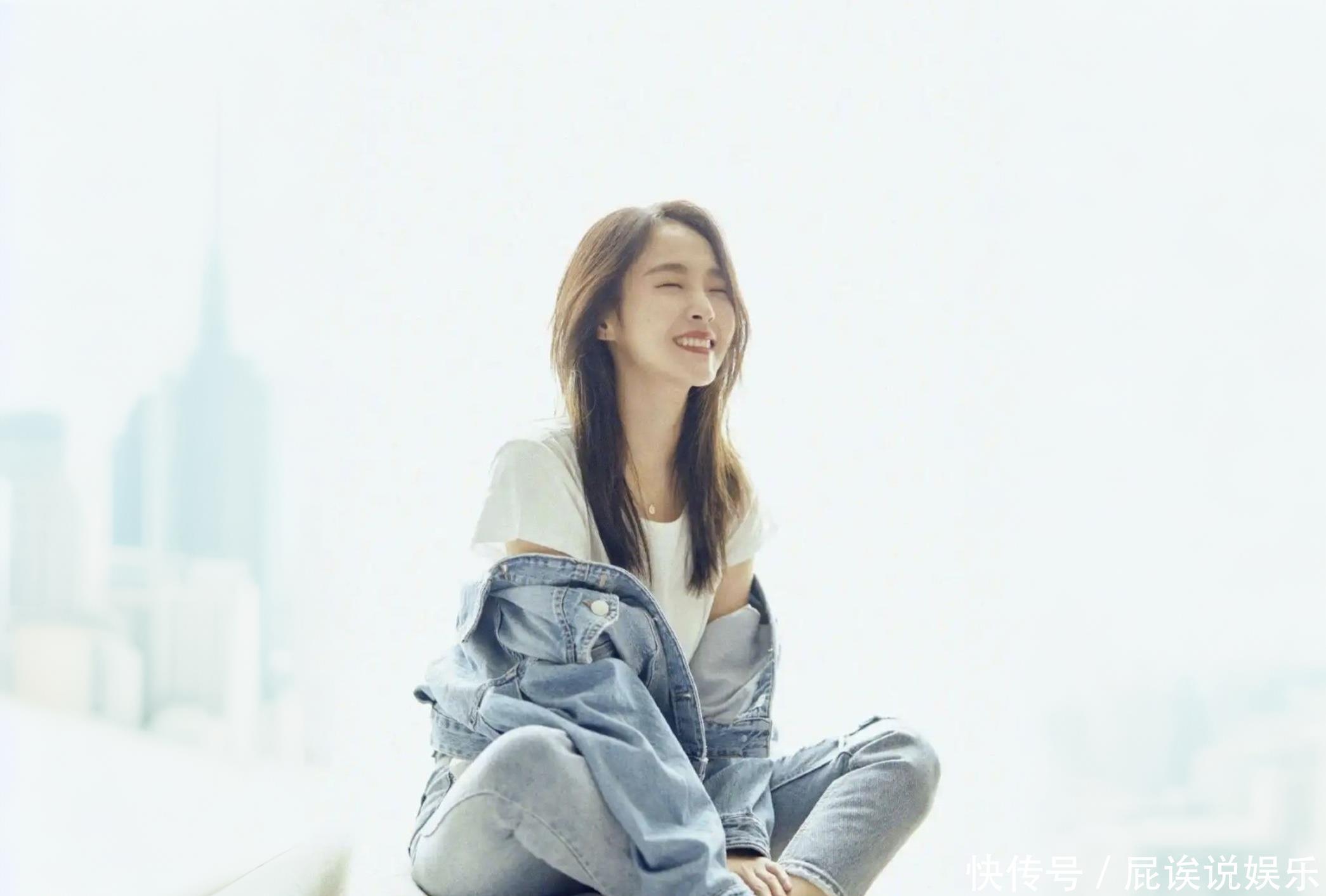 再说这穿搭:白色短袖打底,外套浅蓝牛仔衣,袖子随便挽着。下身是同色破洞牛仔裤,裤脚毛毛边的,时髦又俏皮。头发棕乎乎地散着,随风飘几根丝儿。她一条腿蜷着,另一条随意搭拉,手还搁脚上,眼睛笑眯成缝儿,瞅着又开心又放松。背后能模糊看见高楼影子,估计位置挺高,光打得暖暖和和的。