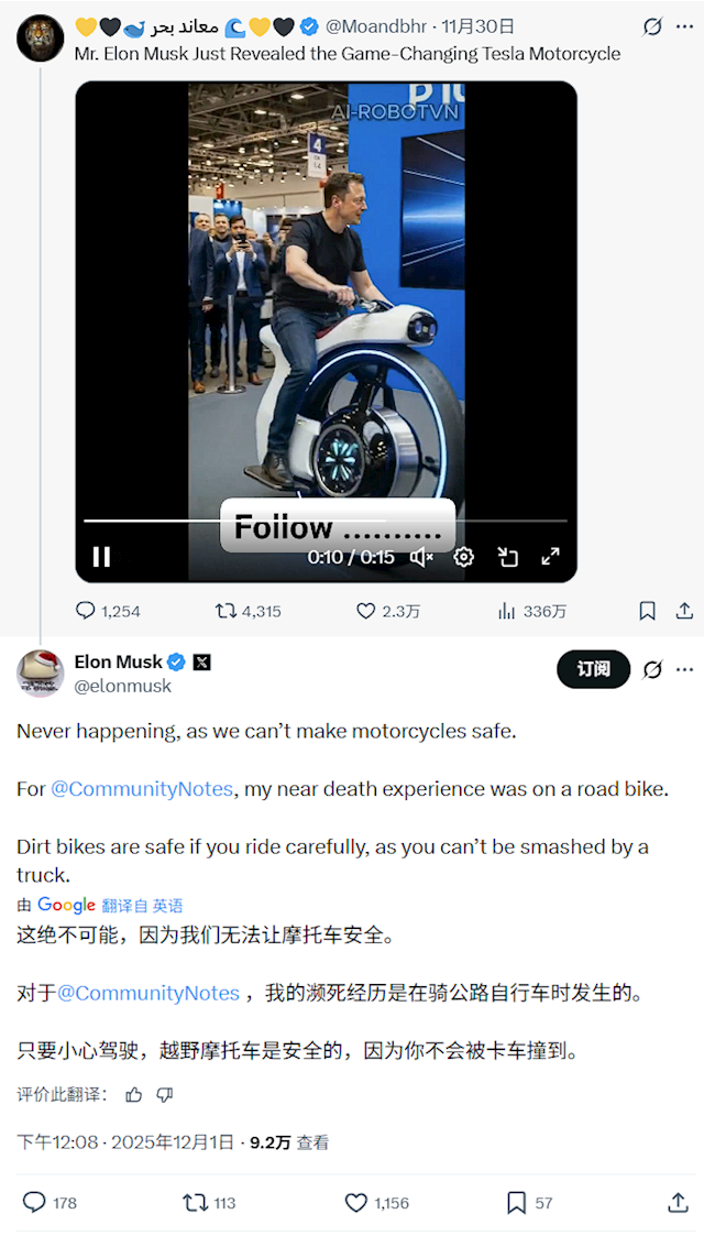 近日有X用户发布了一条利用AI生成的视频,视频里,马斯克本人骑上一台摩托,在众人的注释下和掌声里一溜烟跑走。